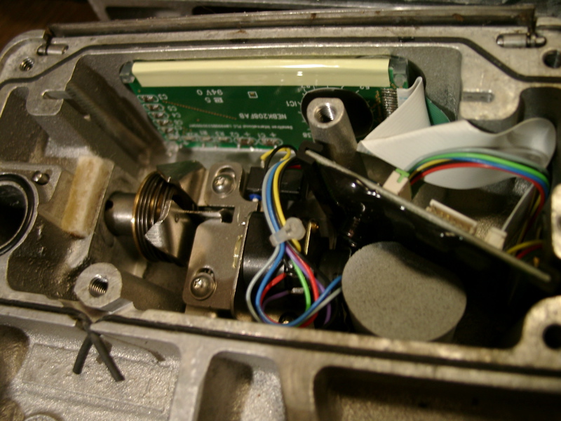 Der Kasten mit dem Display enthält den Exzentermotor zum öffnen des Schlosses, zwei Taster (Mikroschalter) und ein kapazitives 5x2-Touchpad. Die Hauptlogik sitzt unter dem Display. Sie ist nochmal durch eine Metallplatte abgesichert, welche nur die Kabel zum Display/Touchpad durchlässt. Damit wird der Motor und der Verschlussmechanismus vor einer Attacke durchs Display geschützt.